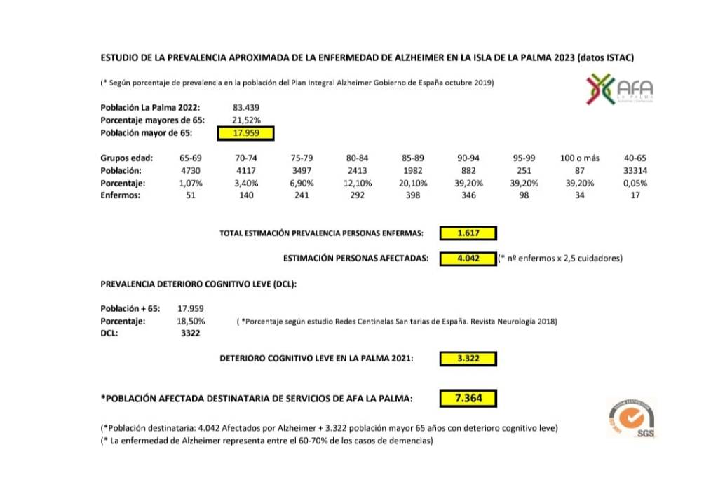 Por ello, como cada año en esta fecha, desde la Asociación de Familiares de Enfermos de Alzheimer y otras Demencias de La Palma (AFA La Palma) publicamos un estudio anual de prevalencia aproximada de personas afectadas por la enfermedad de Alzheimer y el deterioro cognitivo en nuestra isla.