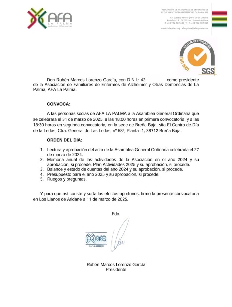 La Asociación de Familiares de Enfermos de Alzheimer y otras Demencias de La Palma (AFA La Palma), convoca a las personas socias de la Entidad a la Asamblea General Ordinaria que tendrá lugar el 31 de marzo de 2025, en el Centro de Día de Las Ledas (Breña Baja)
